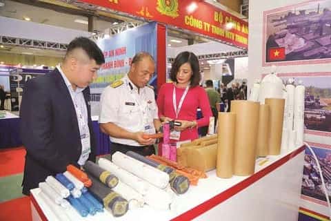 Khách hàng xem giới thiệu sản phẩm vật liệu nổ công nghiệp tại gian trưng bày của Tổng công ty GAET trong Triển lãm quốc tế về Quốc phòng và An ninh Việt Nam (DSE Vietnam 2019). Ảnh: THÁI ANH