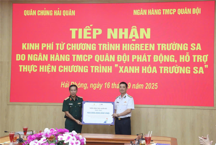 CNQP&KT - Ngày 16/9, tại Bộ Tư lệnh Quân chủng Hải quân đã diễn ra buổi trao tặng 160 tỷ đồng từ Chương trình HiGreen Trường Sa do Ngân hàng TMCP Quân đội (MB) phát động với mục tiêu trồng 1 triệu cây phủ xanh đặc khu Trường Sa, tỉnh Khánh Hòa.