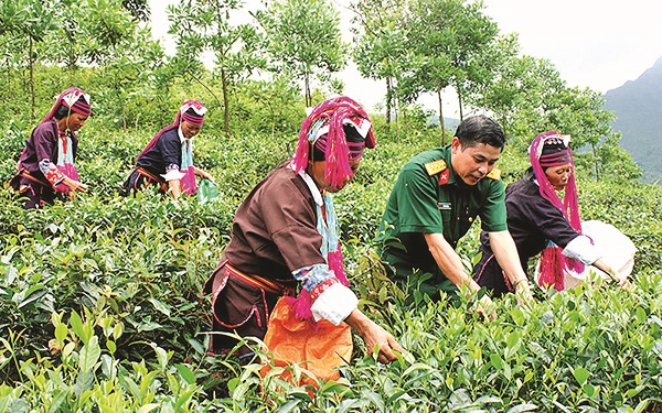 Cán bộ Lâm trường 103, Đoàn KT-QP 327 (Quân khu 3) hướng dẫn kỹ thuật thu hái chè cho người dân vùng dự án.    Ảnh: CTV