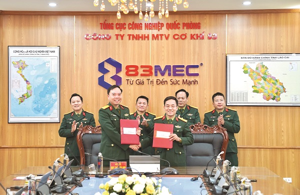Lãnh đạo, chỉ huy Nhà máy Z183 và lãnh đạo, chỉ huy Trường Cao đẳng CNQP trao biên bản hợp tác đào tạo nguồn nhân lực.      Ảnh: PHƯƠNG MAI