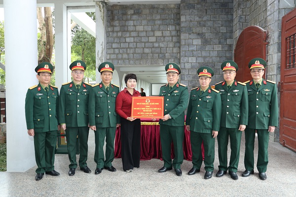 Thiếu tướng Nguyễn Đức Tăng, Phó Chính ủy Tổng cục CNQP trao quà của Quân ủy Trung ương, Bộ Quốc phòng tặng Ban quản lý Nghĩa trang liệt sĩ Quốc gia A1.