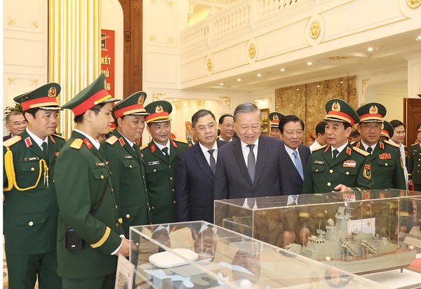 Đồng chí Tổng Bí thư Tô Lâm và các đại biểu tham quan một số sản phẩm do Tổng cục CNQP nghiên cứu chế tạo.