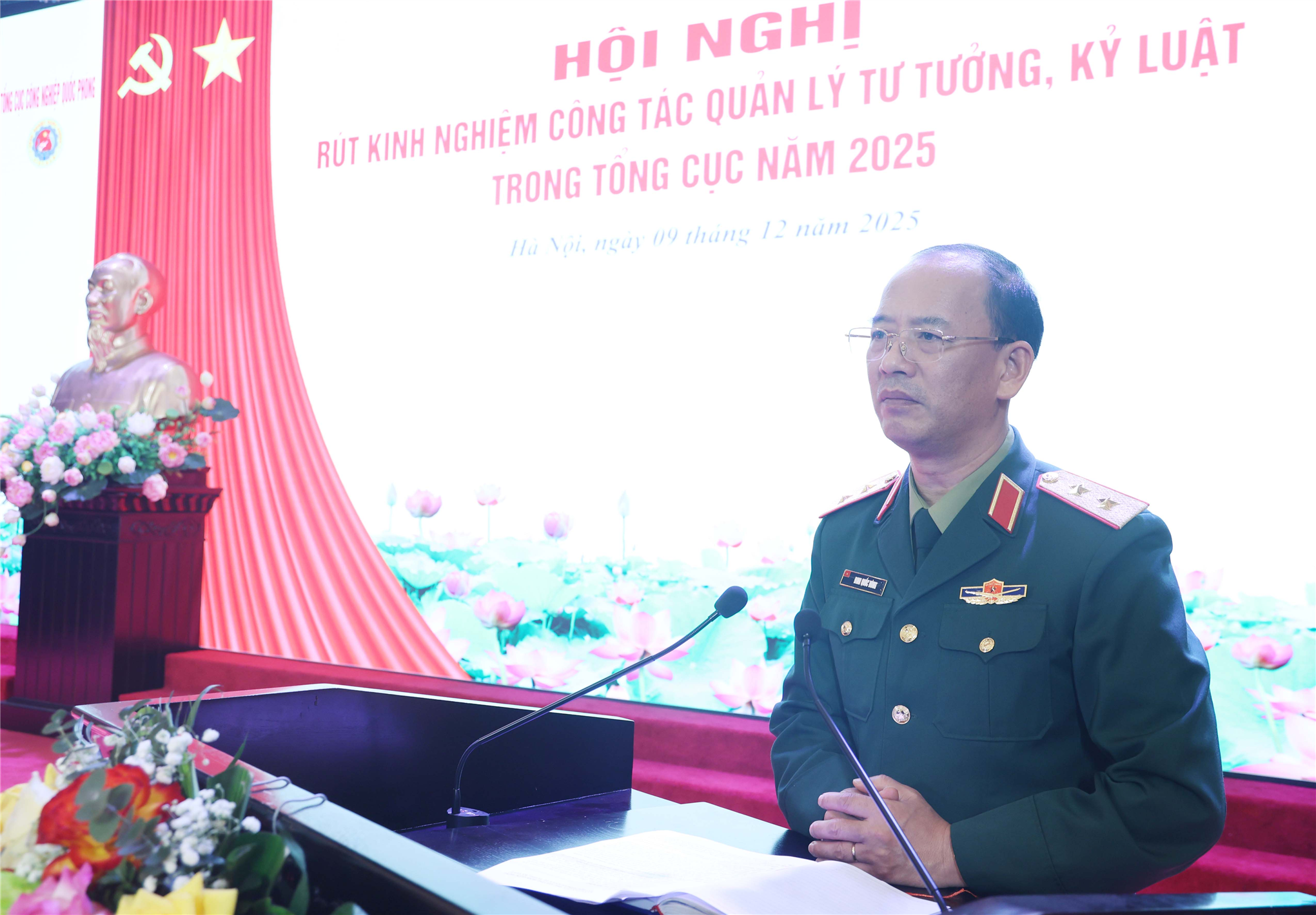 Tại Hội nghị, Thiếu tướng Lê Ngọc Thân, Ủy viên Thường vụ Đảng ủy, Chủ nhiệm Chính trị Tổng cục, đã phổ biến kết luận của lãnh đạo Tổng cục Chính trị về công tác quản lý tư tưởng, kỷ luật trong Quân đội năm 2025; trình bày báo cáo kết quả công tác quản lý tư tưởng, kỷ luật trong Tổng cục năm 2025. Trong đó nêu rõ: Năm 2025, Đảng ủy, chỉ huy Tổng cục CNQP và cấp ủy, chỉ huy các cơ quan, đơn vị tập trung lãnh đạo, chỉ đạo triển khai thực hiện chặt chẽ, đồng bộ các nội dung, hình thức, biện pháp tiến hành công tác tư tưởng kết hợp xây dựng chính quy và rèn luyện kỷ luật. Cấp ủy, chỉ huy các cấp đã tập trung làm tốt 5 “khâu” cơ bản (nắm tư tưởng quân nhân; dự báo tình hình; quản lý, đánh giá, phân loại tư tưởng; định hướng tư tưởng; giải quyết tư tưởng). Thực hiện phân cấp trong công tác tư tưởng từ cấp tổ, đội sản xuất, xí nghiệp, phân xưởng, nhà máy đến cấp Tổng cục. Duy trì nền nếp chế độ phản ánh, báo cáo tư tưởng, vụ việc... kịp thời phát hiện và xử lý tốt những vấn đề nảy sinh, ngăn ngừa những diễn biến tư tưởng phức tạp. Cùng với đó, kết hợp chặt chẽ giữa “xây” và “chống” trong tiến hành công tác tư tưởng, coi trọng việc xây dựng các nhân tố tích cực, các điển hình tiên tiến trong đơn vị, huy động sức mạnh tổng hợp để đấu tranh đẩy lùi tư tưởng tiêu cực, khâu yếu, mặt yếu.