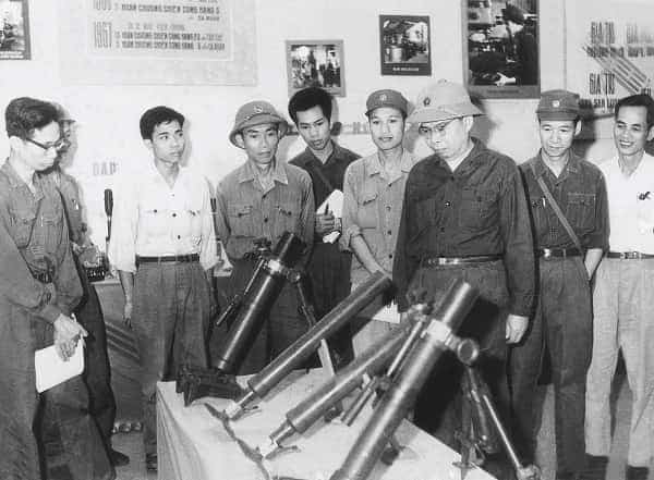 Giáo sư Trần Đại Nghĩa (thứ ba từ phải sang) xem sản phẩm do Quân giới sản xuất thời chống Mỹ.  Ảnh: TL